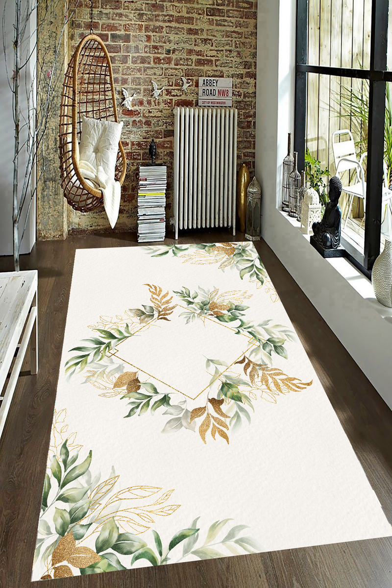 Beyaz Zemin Gold Geometrik Detaylı Dijital Baskılı Halı Örtüsü HRC2627