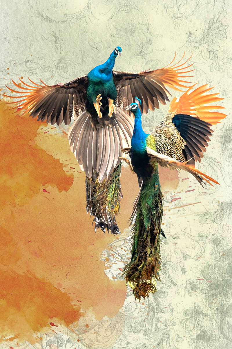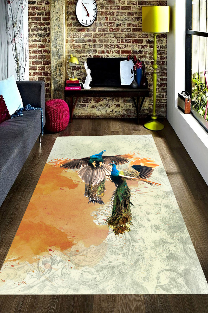 Sulu Boya Efektli Tavus Kuşu Desenli Dijital Baskılı Halı